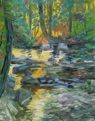 A short hike up the trail, and I found this. The sun cast a shaft of gold light across the stream. It had to be painted very rapidly.