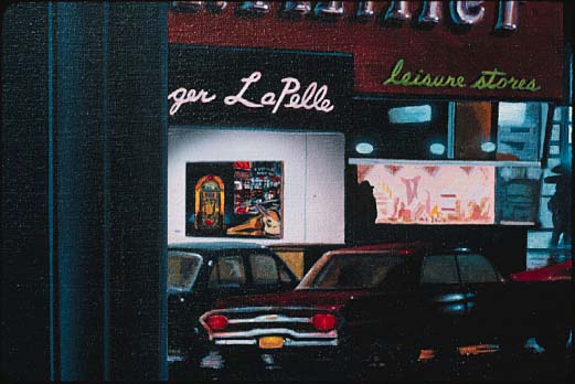 One of the great images of Western society, is a city street, loaded with neon signs on a rainy night...The detail (on right) shows the painting itself, in the window of the gallery, in the painting, which has a painting of the painting within...