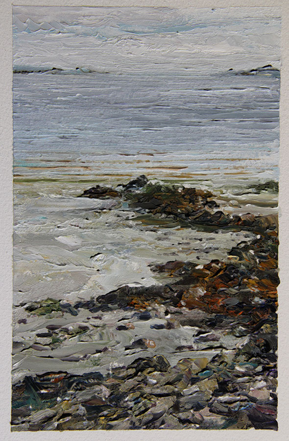 "The Tide Edge 8 x 5 inches 2021 oil $650. As the rocks are exposed, more and more, with each cycle of the moon.