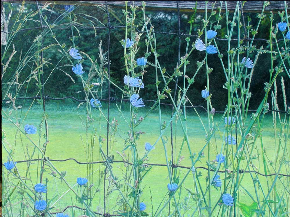 Chickory is one of my favorite wild plants. Here, protected from the mower by a wire fence, a small garden of it twines and waves in the morning sun.