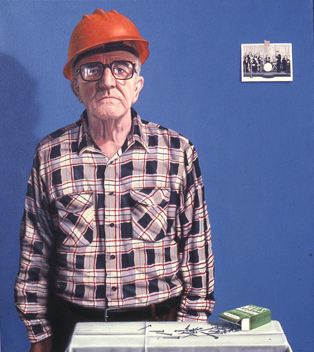 I painted my father as a worker, which he was. He made nails, and howitzer barrels during WW2. He told me the stories of the "Depression," and of how great FDR was. He had a career as a singer in his youth. They called him "the Bing Crosby of Pittsburgh." That is a picture of his band, on the "wall" behind him.