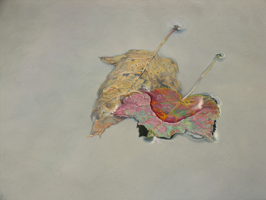 Along the stream below the house, two leafs fell and drifted off. A clear grey sky was above and below.