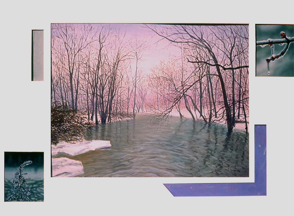When the weather warmed slightly, the ice melted and channeled into barns and basements. At the end of March, the ice on the Brandywine Creek near our home began to melt. The stream flooded and rushed violently loose. I went to the bridge, from the same place where I painted a winter and autumn view of the stream and did this painting from that location.