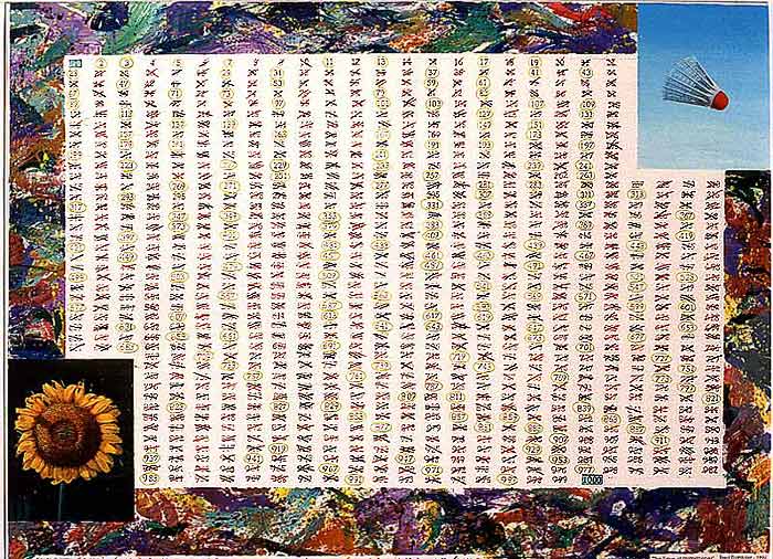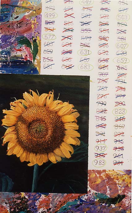 - "The Sieve of Eratosthenes" c. 38" x 46" acrylic and pencil on paper (1995) ...using the "seive" to find all the prime numbers up to 1000.