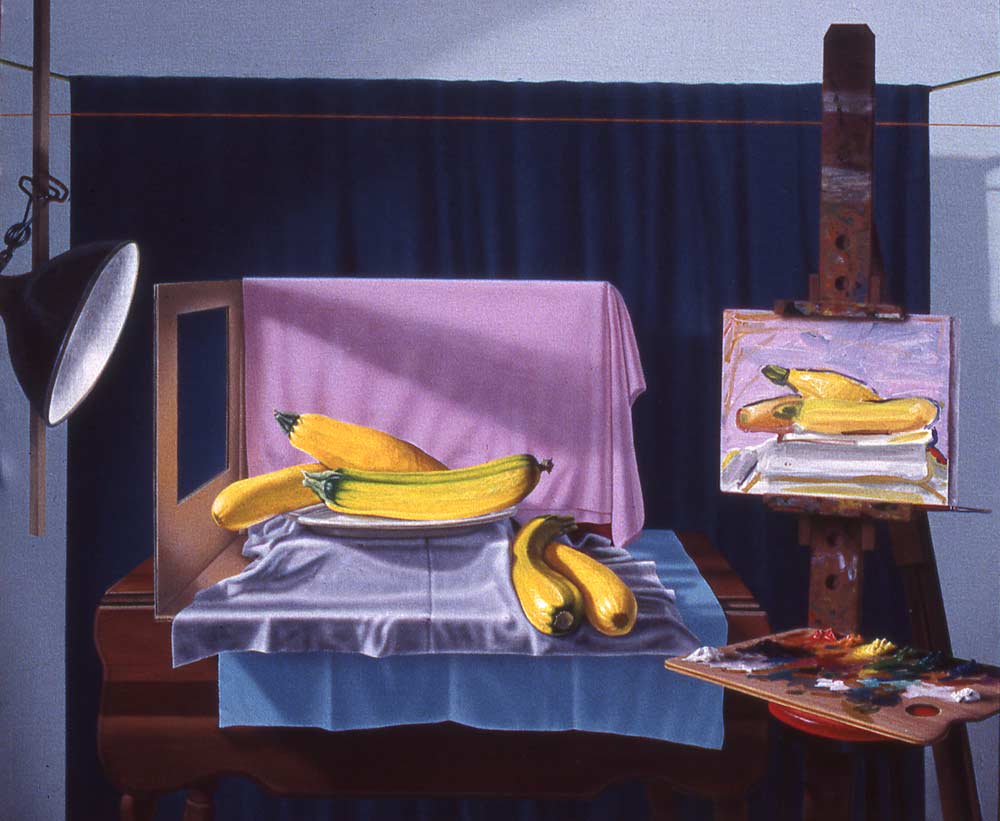 The squash came from the garden. I thought I'd do a still life- but decided to do a piece about "doing a still life."