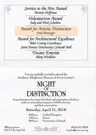 Also MARCH 2018- my work will be featured in an alumni of PAFA show at the Southern Alleghenies Museum of art...Also received their award for "Artistic Distinction" at the 2018 Gala dinner. Many thanks to this wonderful museum!