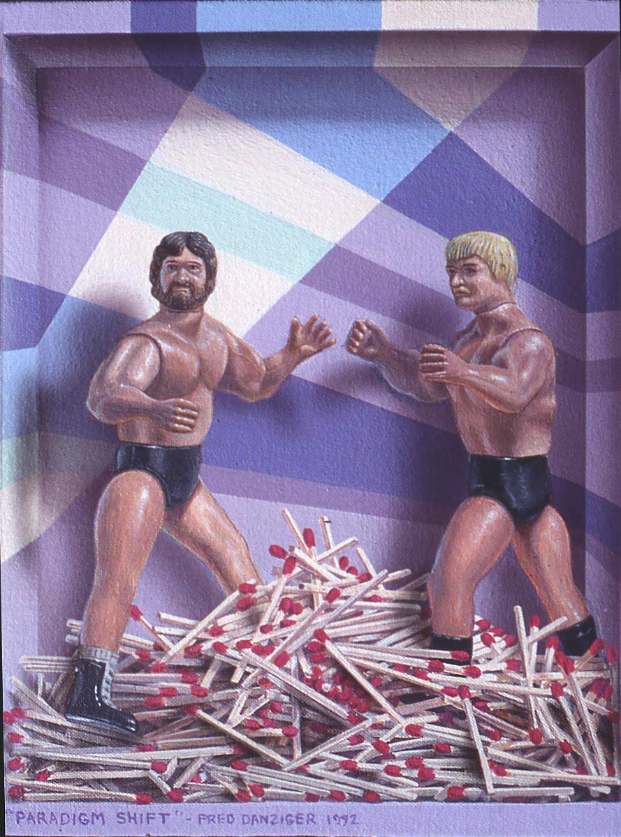 ...two wrestlers confront each other in a pile of matches